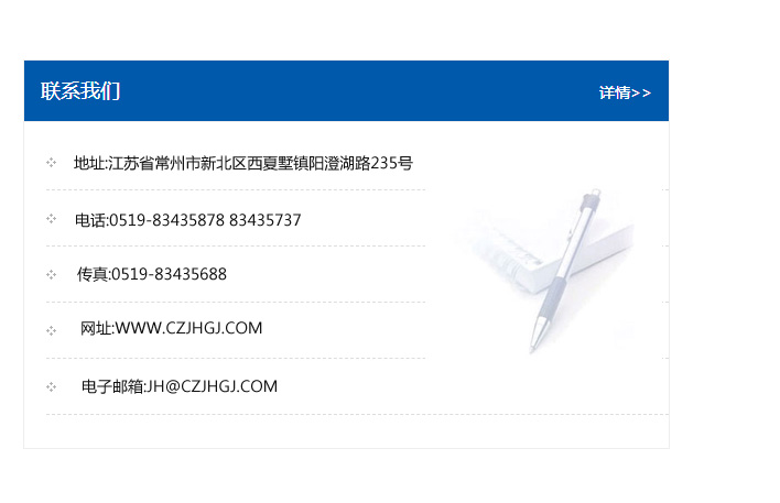 地址:常州市新北區友邦商務大廈1幢16、17層  電話:0519-85101652  傳真:0519-85112595  郵編:213022  網址:www_cz-jiayue_cn.zeon0819.com  郵箱:xiajifengaa@163.com